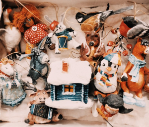 Виктор — и про него была публикация — изготавливает макеты церквей и других зданий, рисует картины, занимается садовой скульптурой. А недавно он создал целую серию авторских елочных игрушек, их мы повезем на ярмарку.